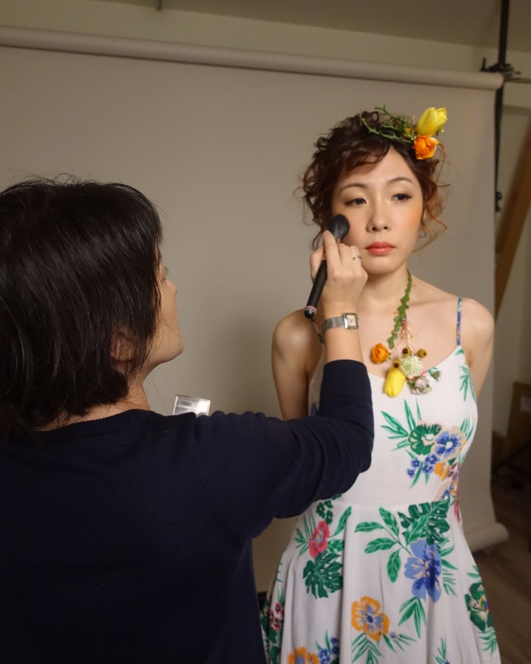 依照色系、花型,以及之前溝通的參考圖,便著手準備服裝,構思妝髮設計。