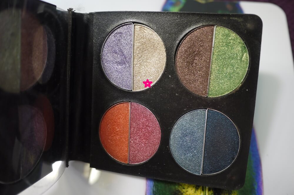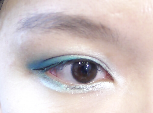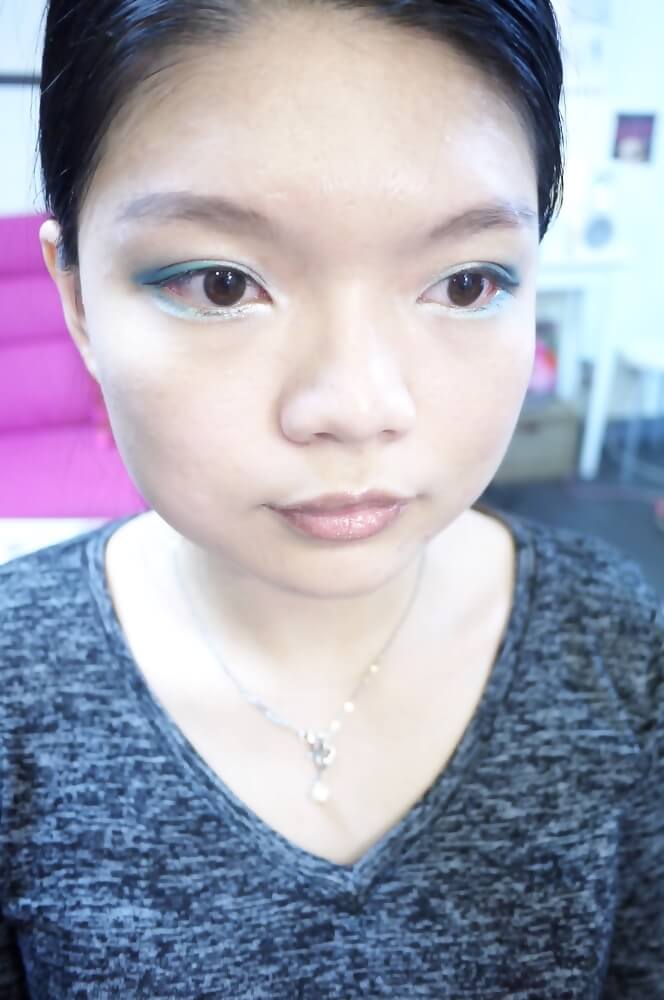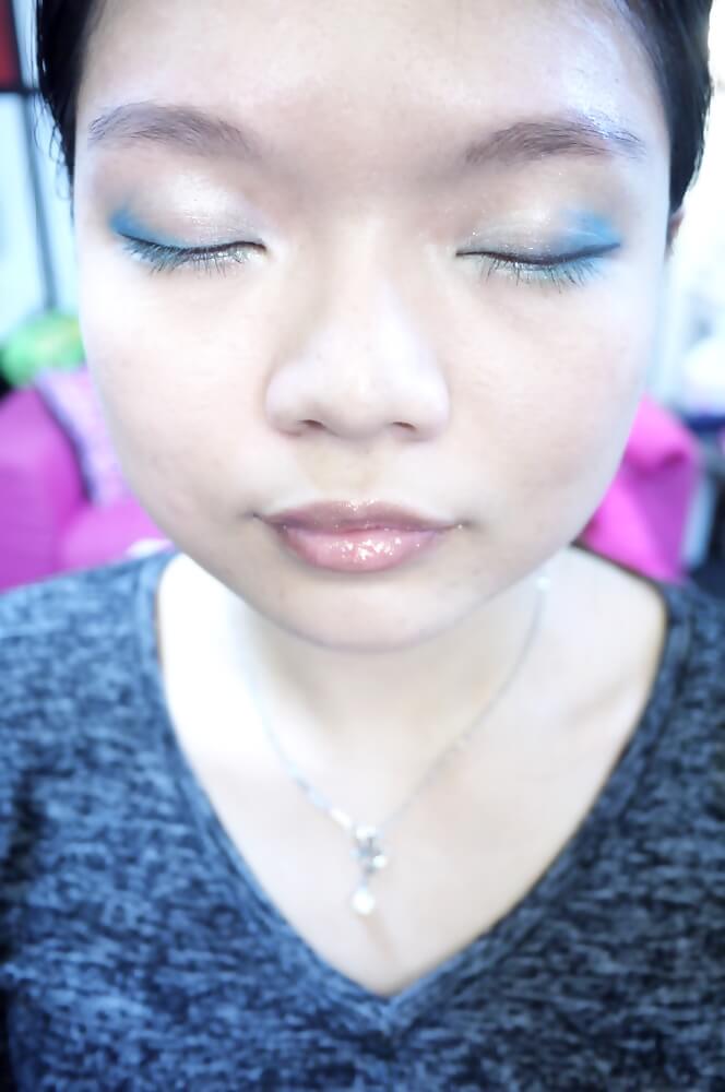但在一個小小的眼影上,使用了4個藍、藍綠,1個膚色,1個銀色珠光,做出漸層。