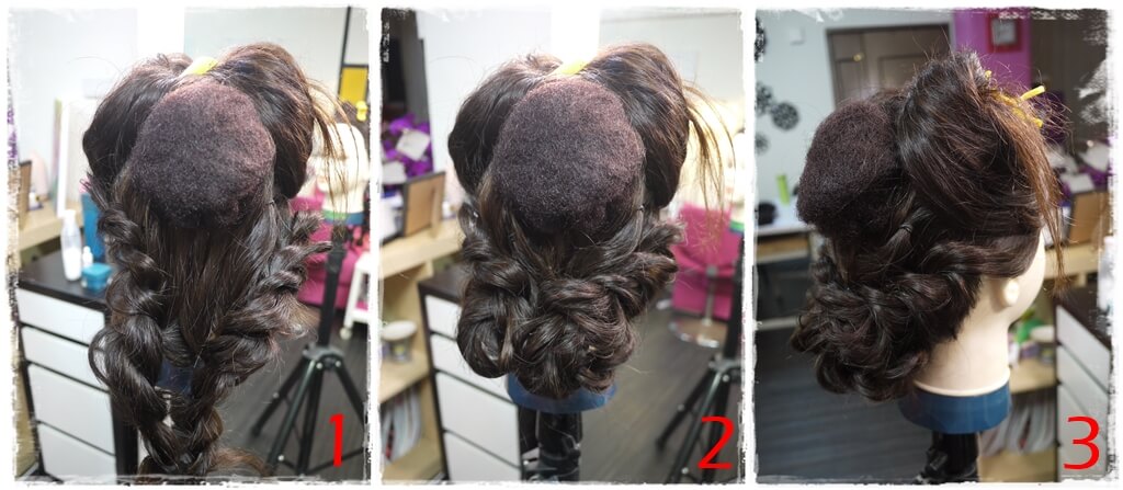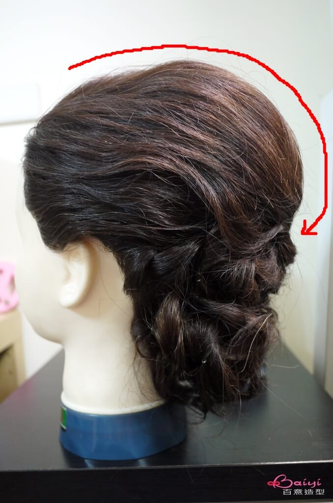 2.將兩股的尾端收起,編成低的編髮包頭。