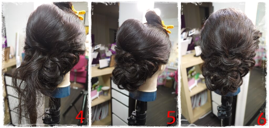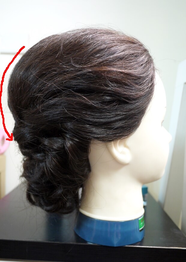 5.剩餘的髮絲用手捲技巧,放在接縫處。