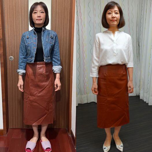 左邊是原本的穿搭,這件裙子就是哪裡怪怪的,學生說。其實是因為上身的衣服材質(粗布感),