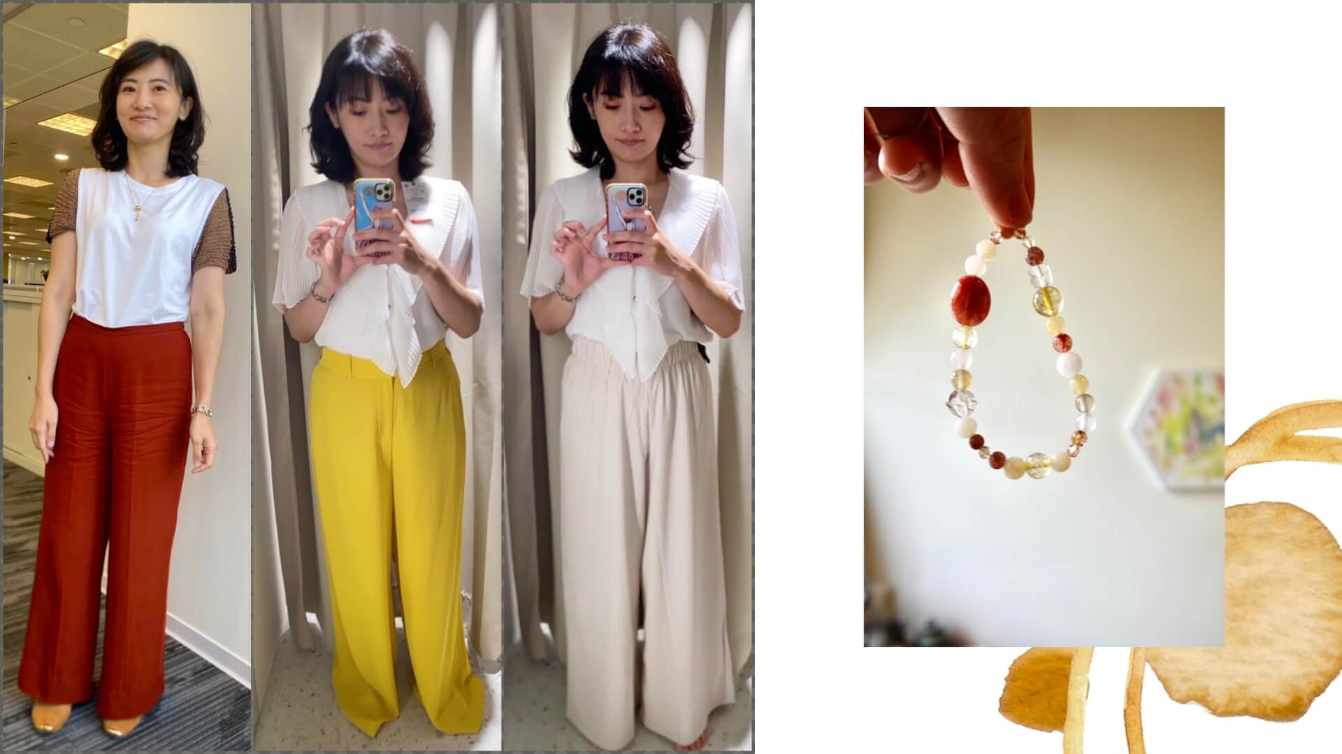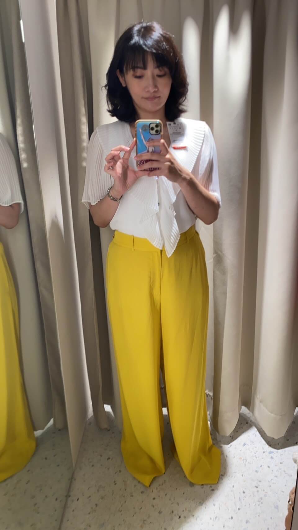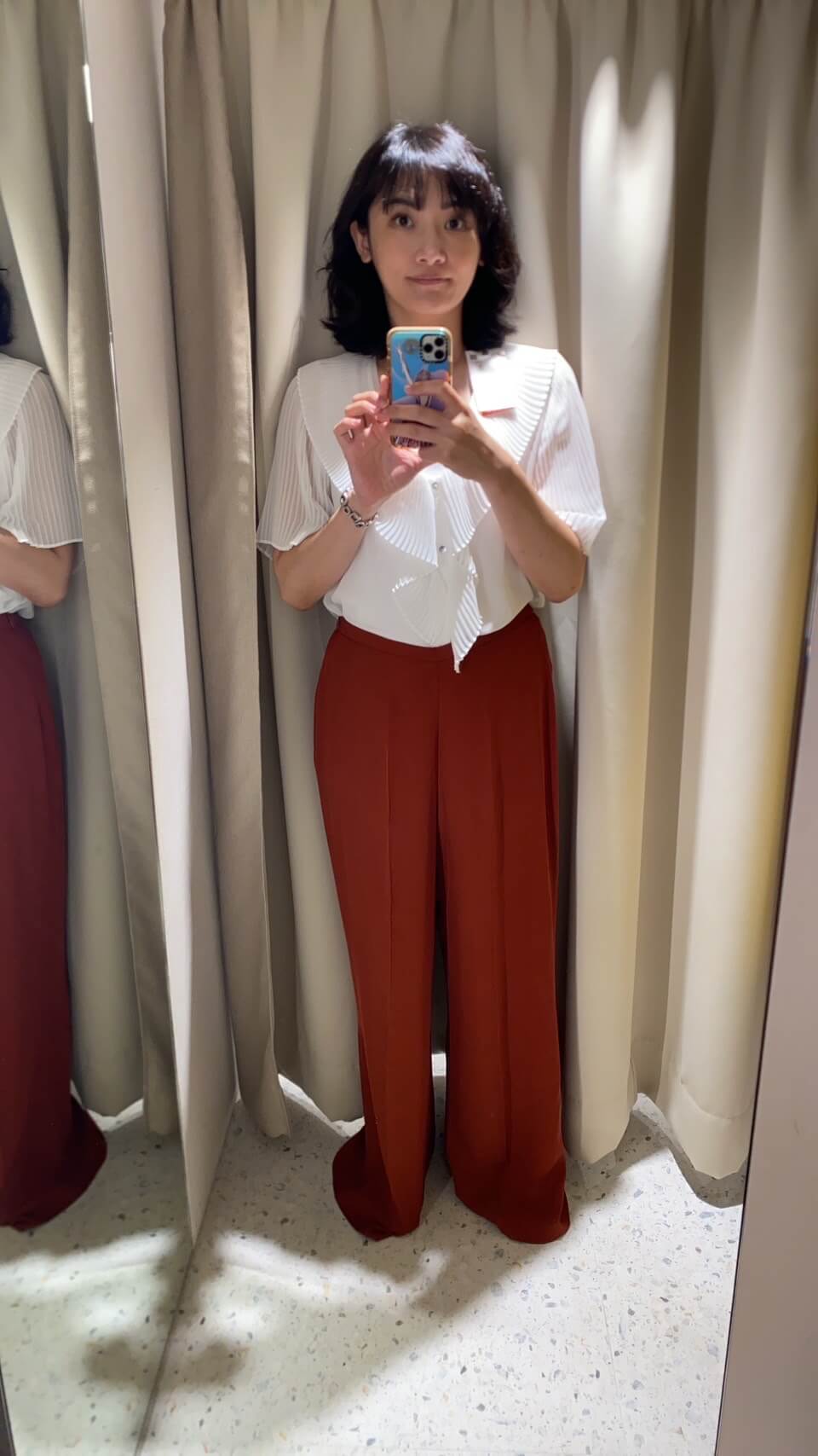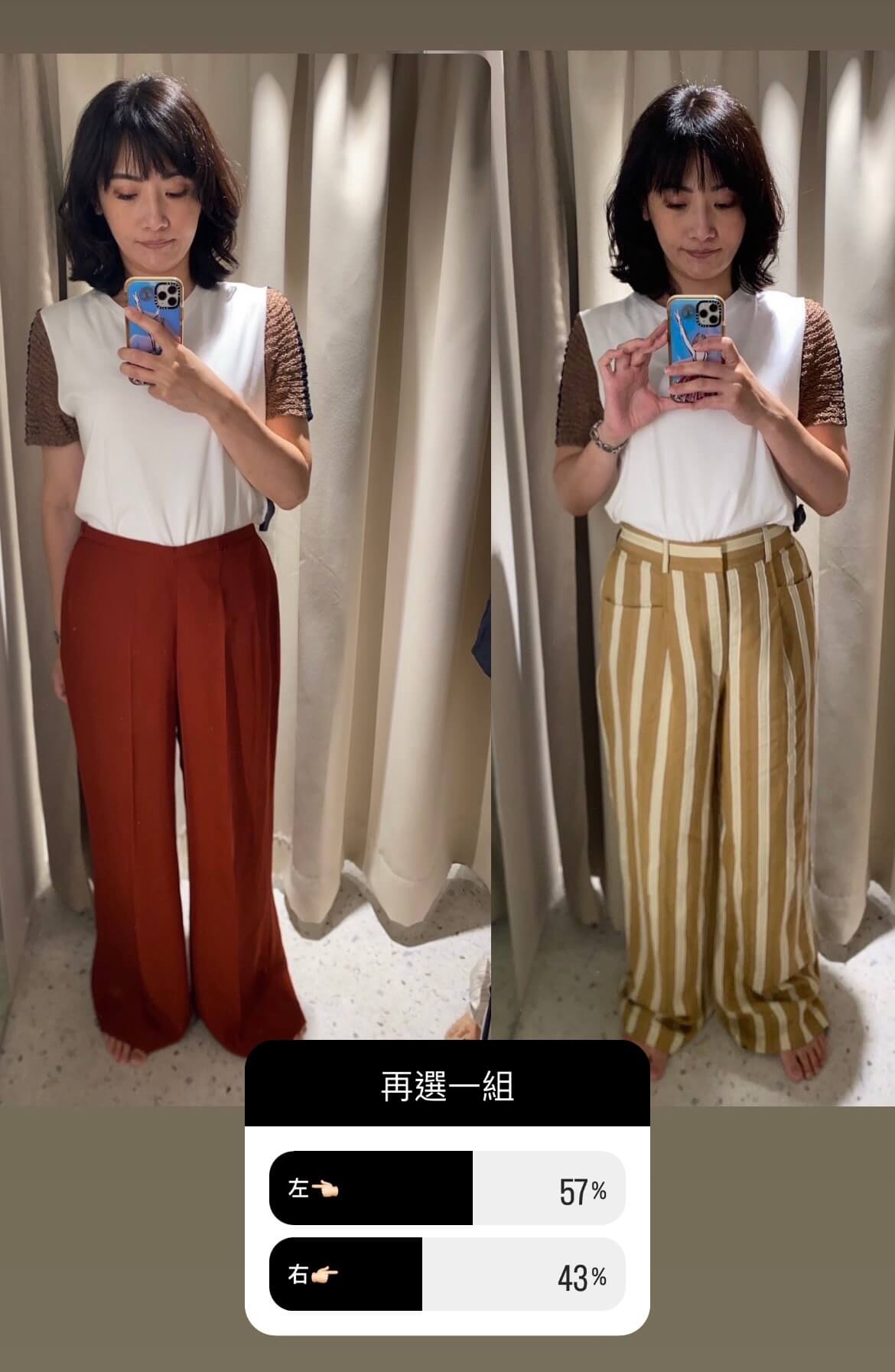 兩種「穿搭加分公式」後,我又去抓了幾件不同顏色的寬褲讓她試穿。