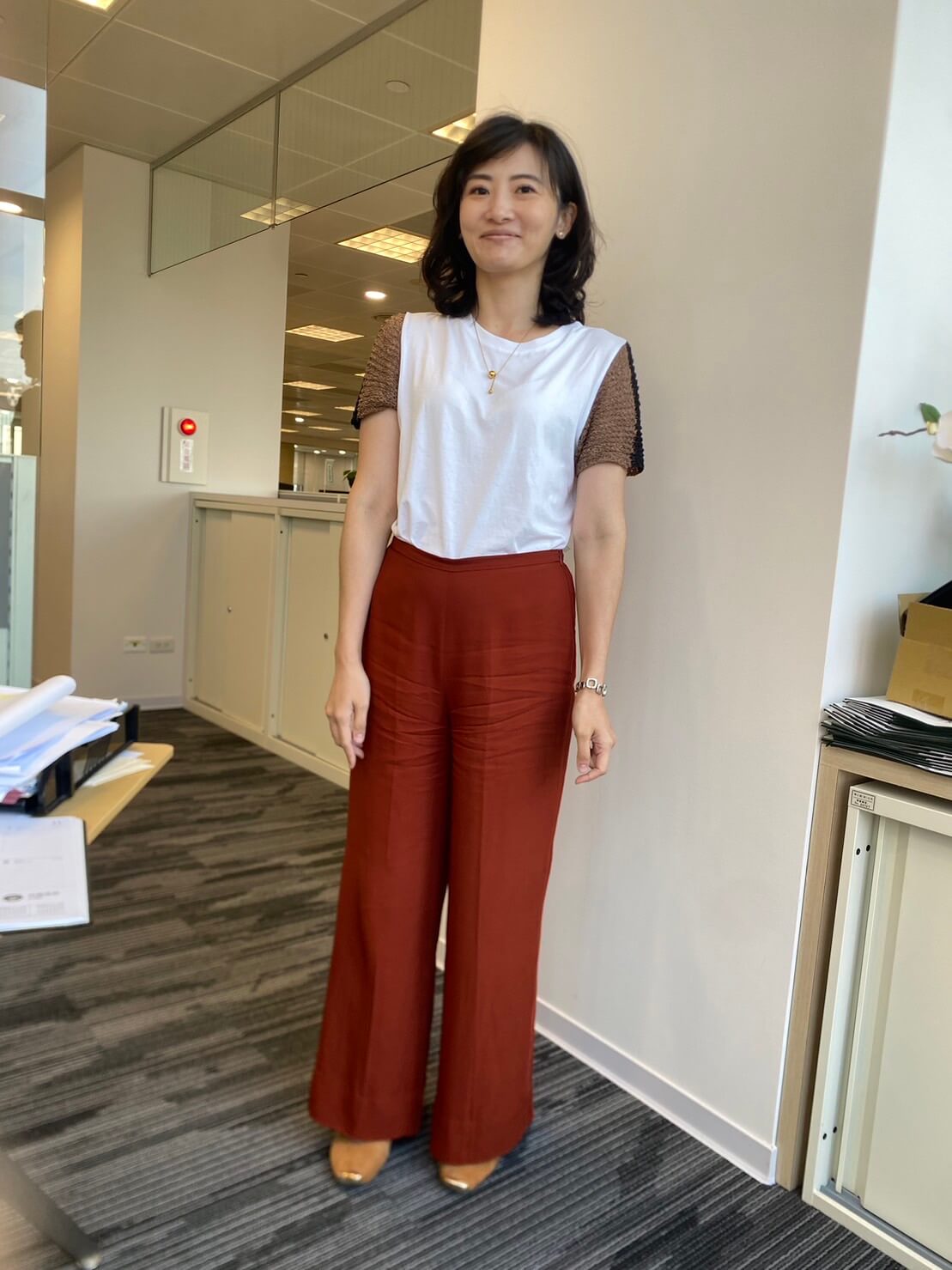 磚紅色和亮黃色褲子,這樣的亮點才是家澄溫暖又俐落的自在形象。