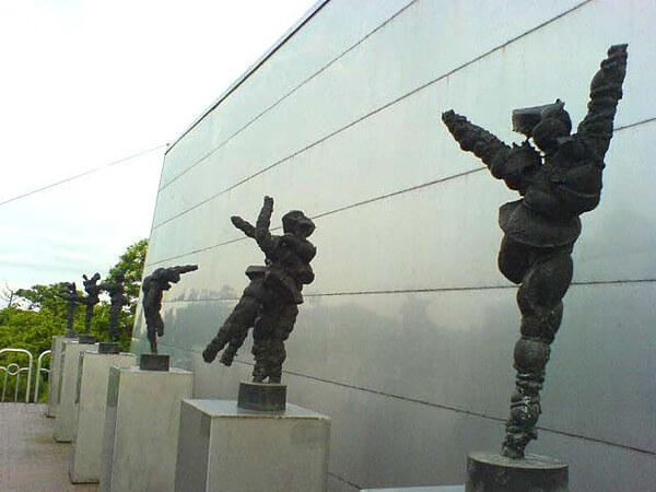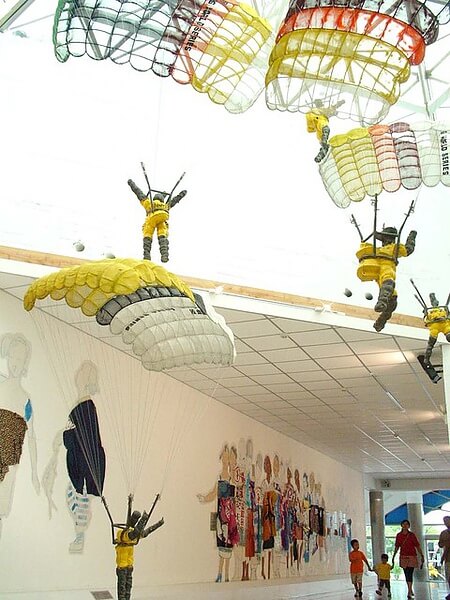 降落傘部隊是銅製(三軍系列),牆上的拼貼是人間系列-眾生像。