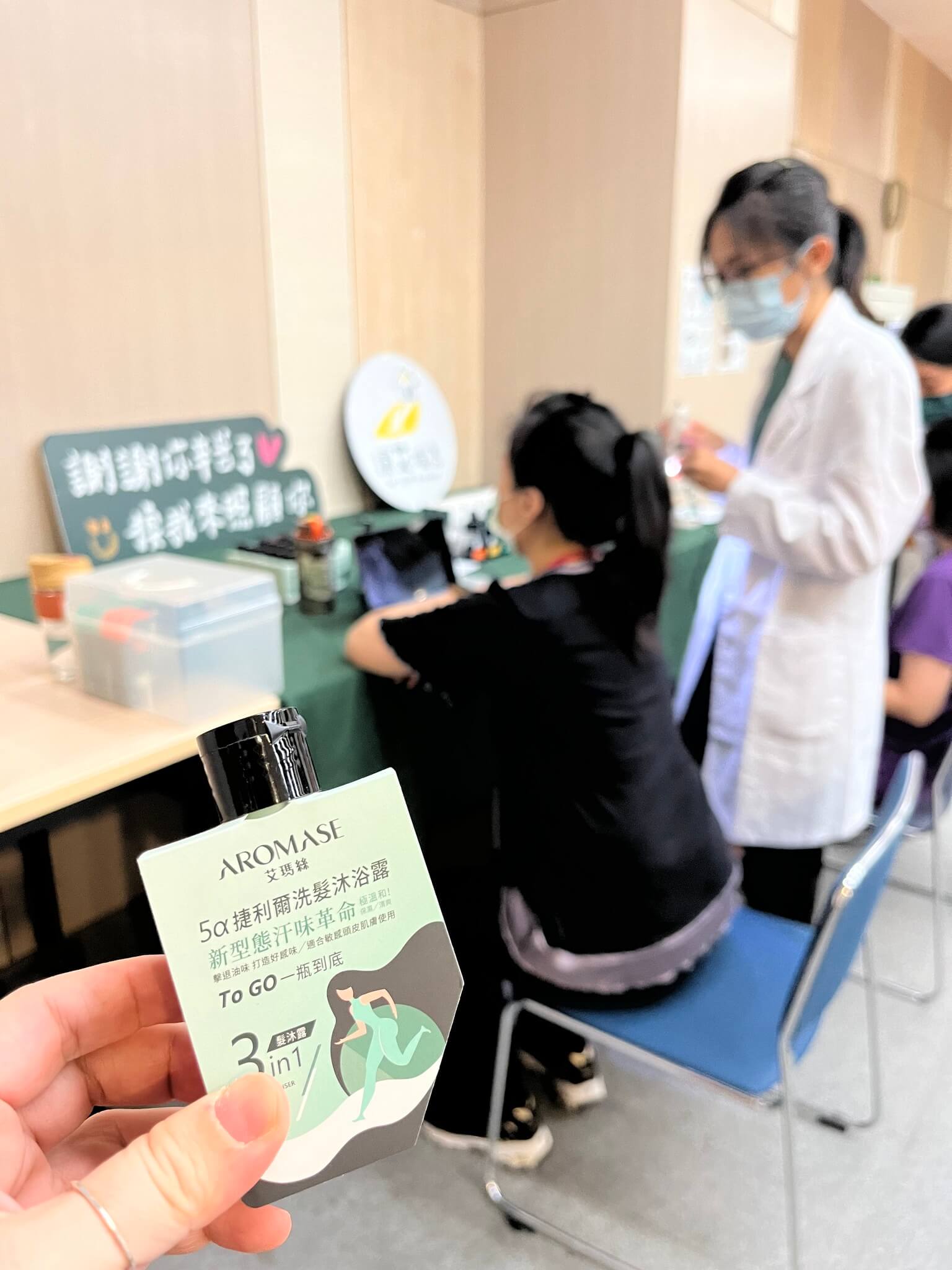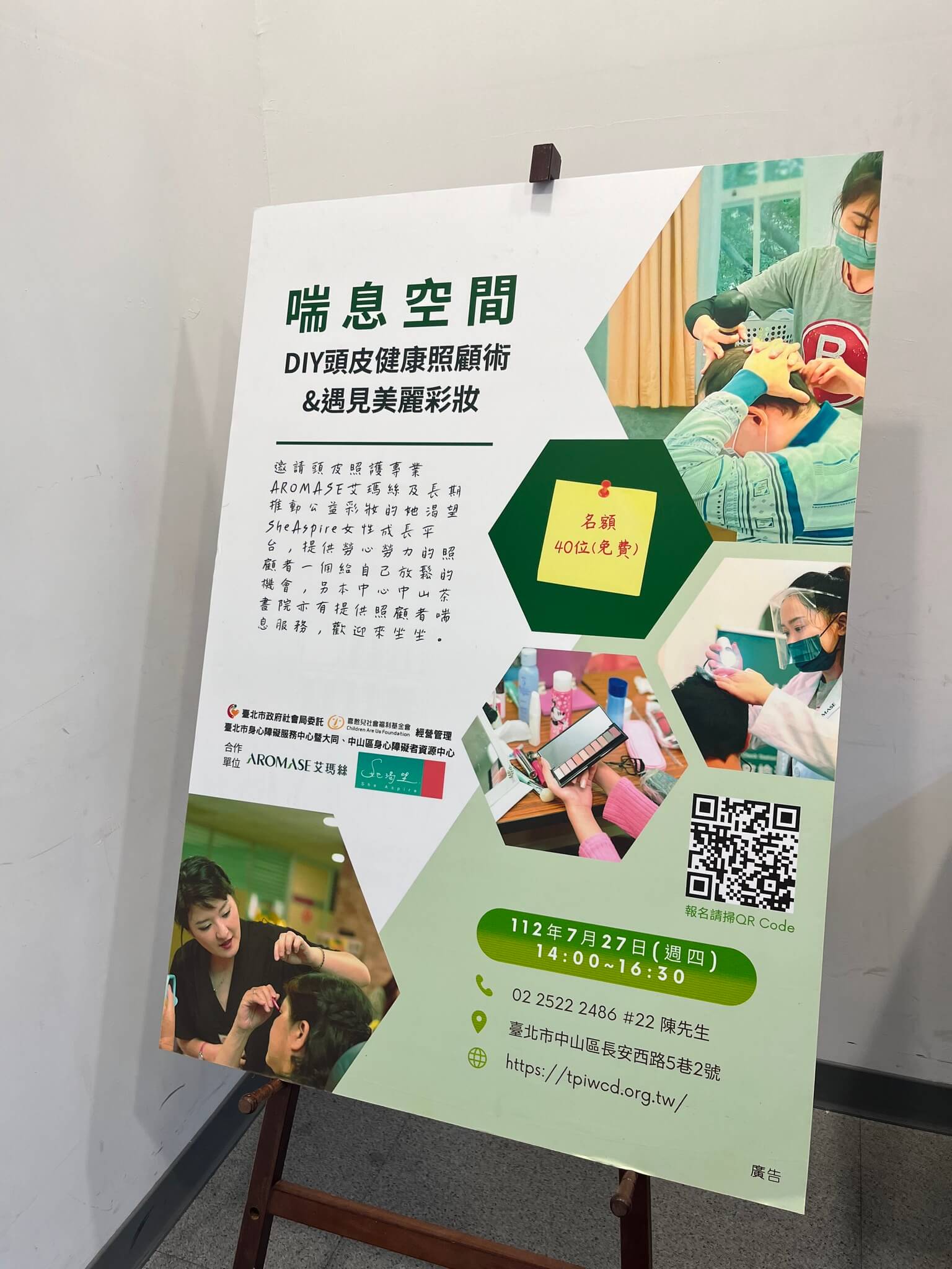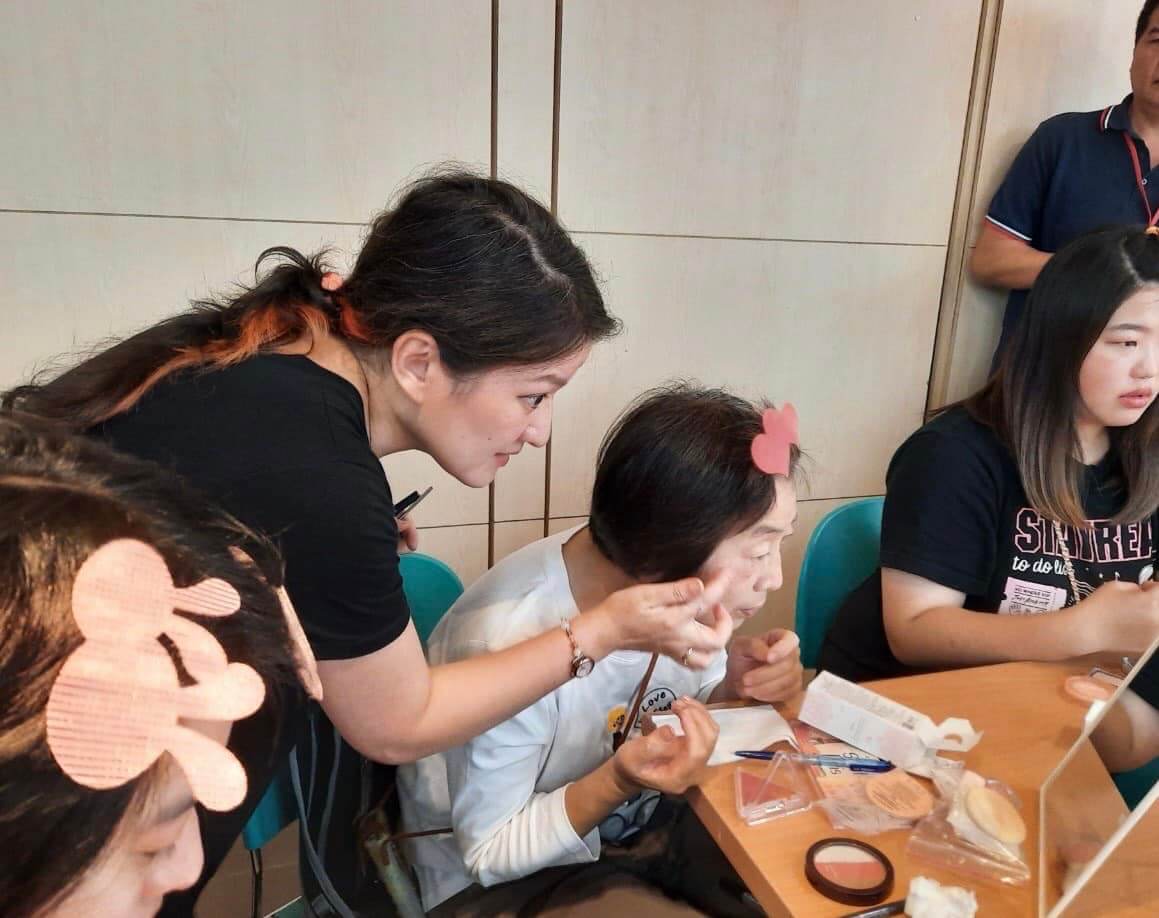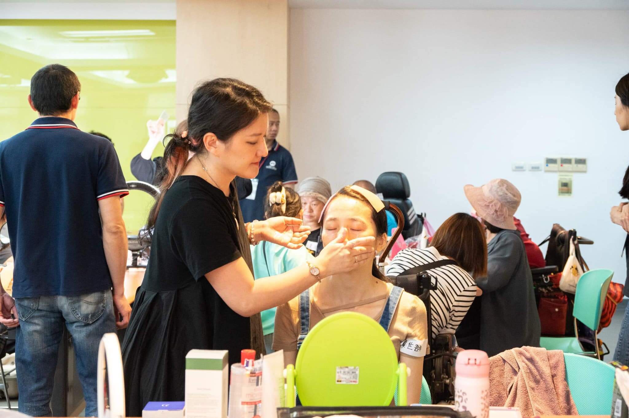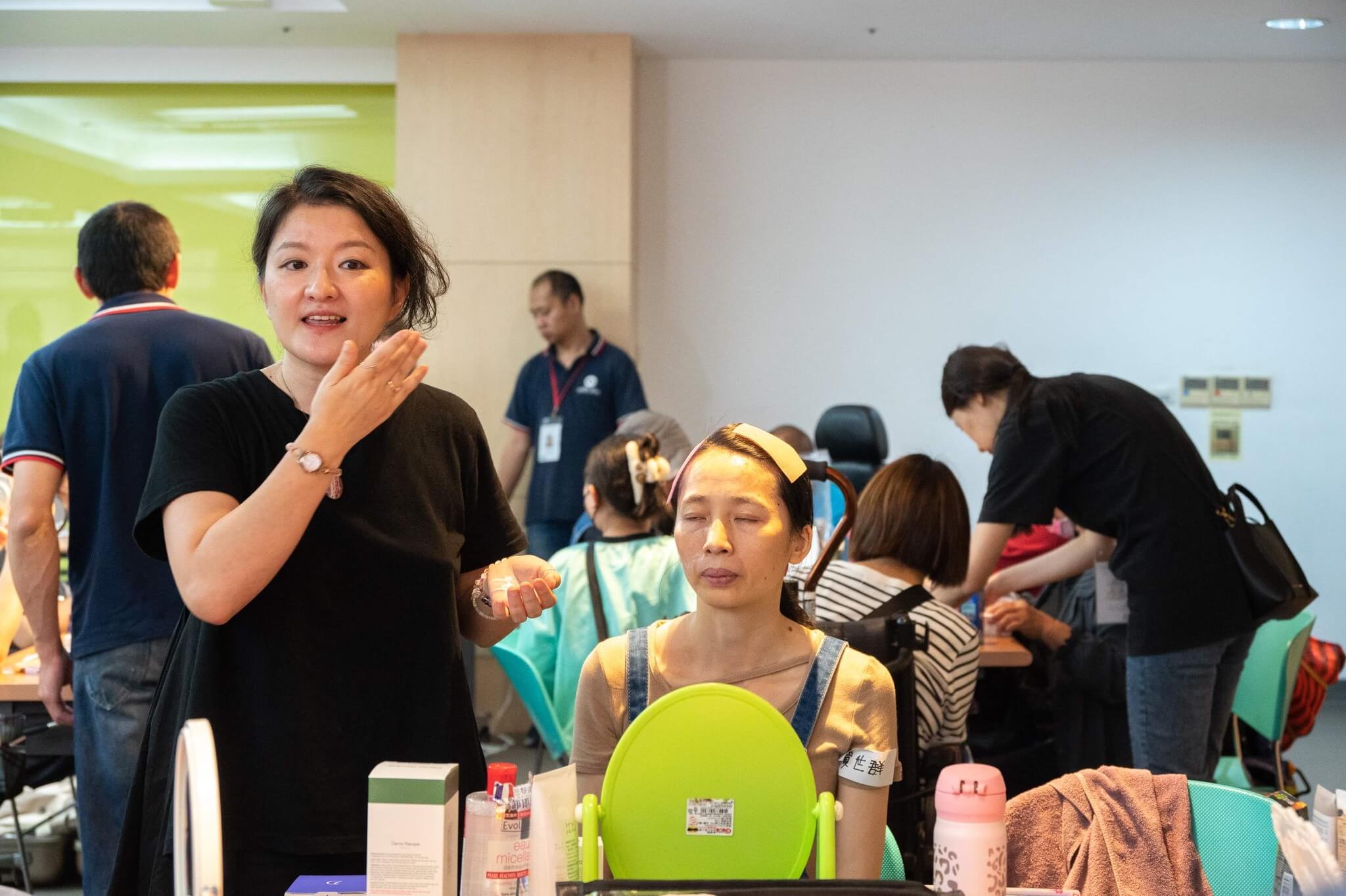 由喜憨兒社會福利基金會辦的喘息空間,邀請艾瑪絲照顧大家的頭皮,她渴望公益彩妝教學。