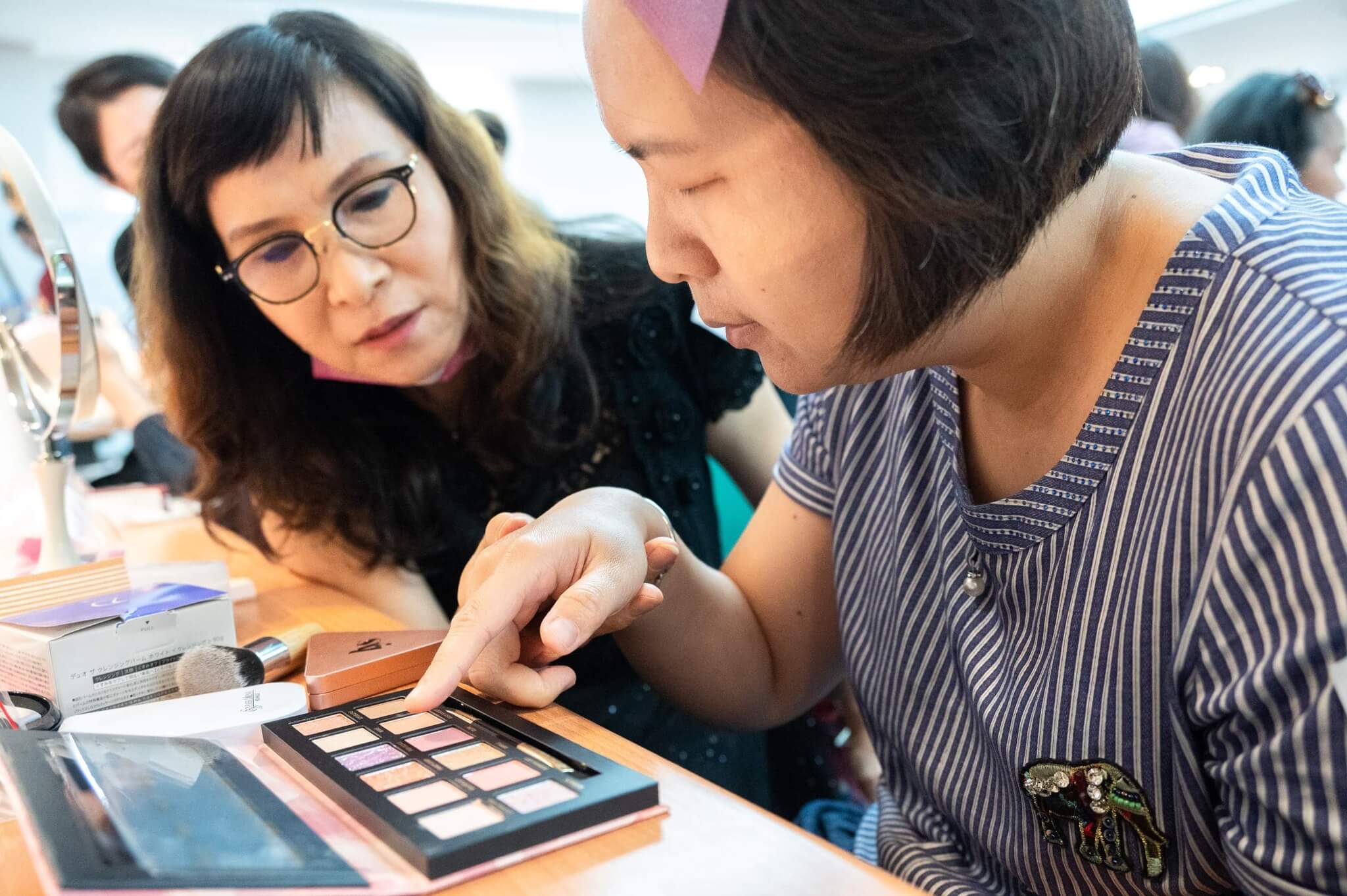 因此我在視障彩妝教學的過程裡,雖然不能客製彩妝品、用味道溝通,但也盡可能的,把她們使用在臉上的顏色形容出來。