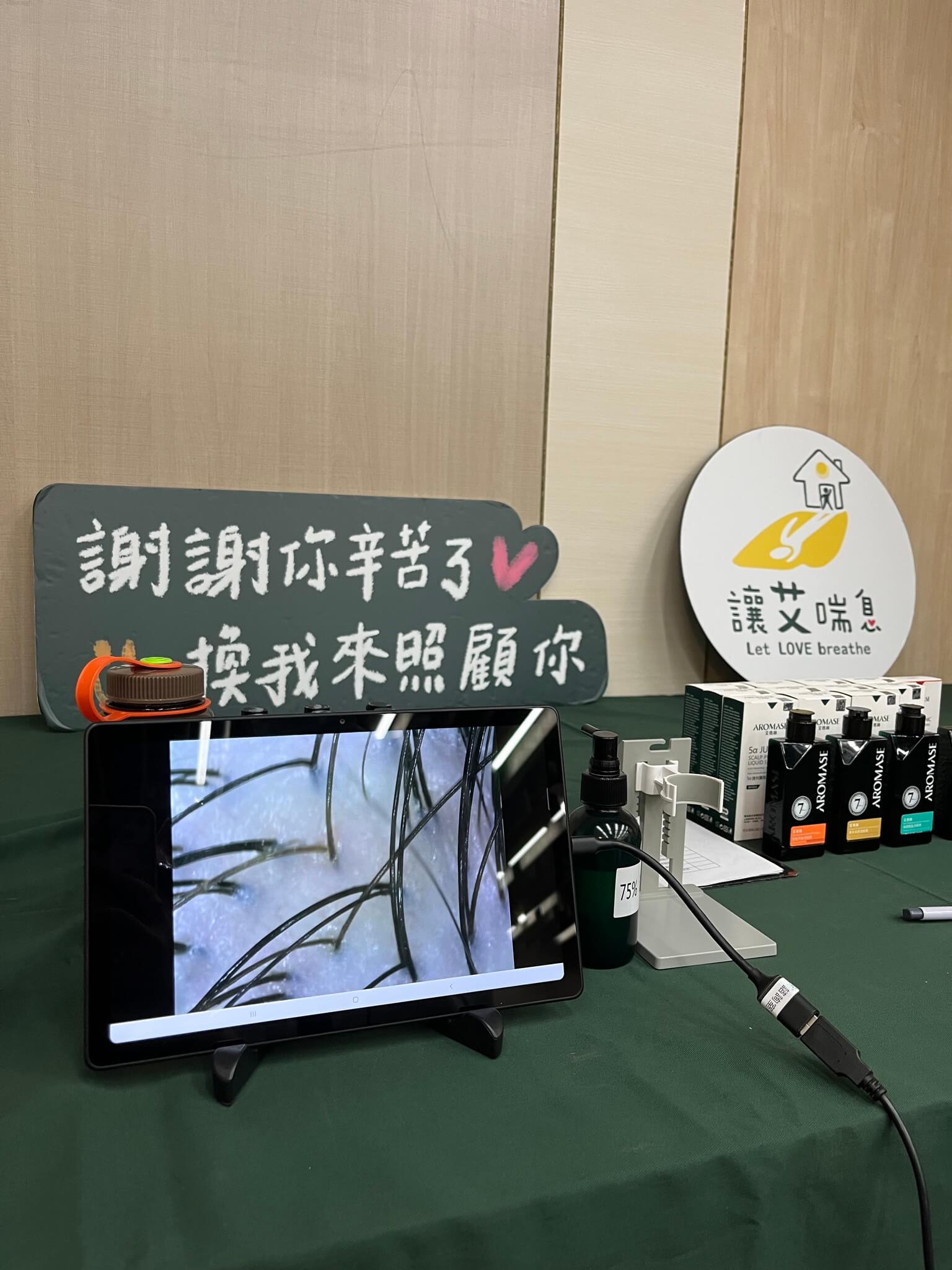 今天在學員入場前,艾瑪絲也邀請了我們去做頭皮檢測。先詢問了洗頭習慣,再用儀器讓我們看到被放大的頭皮。