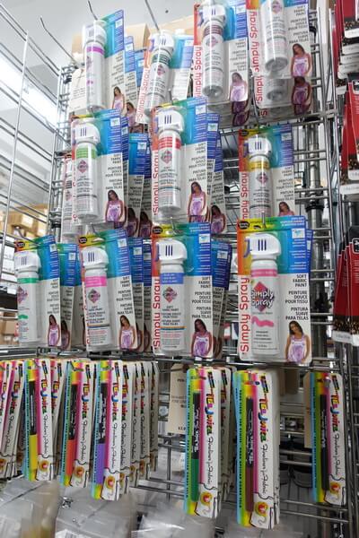 一整面牆,各 種 顏 色的顏料、各種織帶。