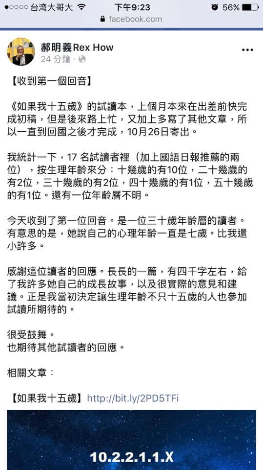 那天泡溫泉,讀的就是郝先生<如果我15歲>的試讀本。超幸運的剛好在出門時拿到手,